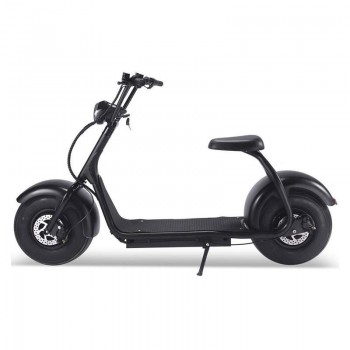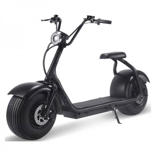 The MotoTec Fat Tire 60v 18ah 2000w lithium powered electric scooter features absolutely massive 18" x 9.5" air-filled tires. It also comes with; front/rear hydraulic brakes, LED headlight, and keyed ignition. The oversized tires are all that's needed to cushion the road. If you ride a bumpy road, simply decrease tire pressure for a smoother ride.